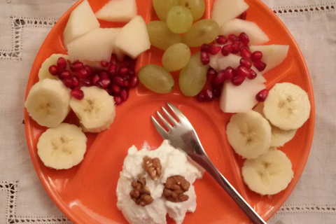 Dopo aver ben lavato l’uva e liberato della buca il resto tagliare e predisporre il tutto sul piatto