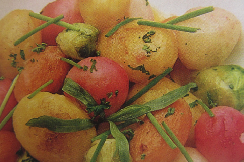 - Preparare per la cottura a vapore mettendo prima le patate e carote, aggiungere 3’ i ravanelli e dopo 7’ i cavoletti. Terminata la cottura a vapore, in tutto circa 12-13’ togliere tutto e passare in un tegame con l’olio, mettere sul fuoco per 5’ per far dorare la superficie girando spesso, al termine versare il prezzemolo tritato e l’erba cipollina