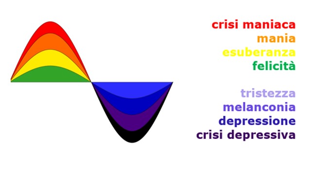 Il disturbo bipolare, noto anche come depressione maniacale, è una malattia della psiche che coinvolge stati di coscienza alternati, quindi: sbalzi d’umore. La fase maniacale comporta un’attività cerebrale accelerata, una maggiore energia, comportamenti eccessivi e stati d’animo euforici fino alla disforia. La successiva fase depressiva coinvolge umore ed energia decisamente sotto tono fino ad arrivare a idee di suicidio visto come l’unica alternativa al malessere profondo. Un’immagina grafica fa comprendere meglio la rappresentazione delle fasi altalenanti: