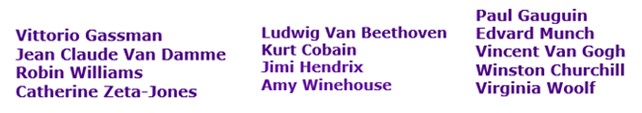 Chi non ha avuto modo di apprezzare la musica o le immagini prodotte dai personaggi elencati? Ciò che possiamo dedurre è che la creatività è stata decisamente intensa nelle fasi maniacali a beneficio del disagio psichico purtroppo non riconosciuto nelle fasi di depressione profonda.